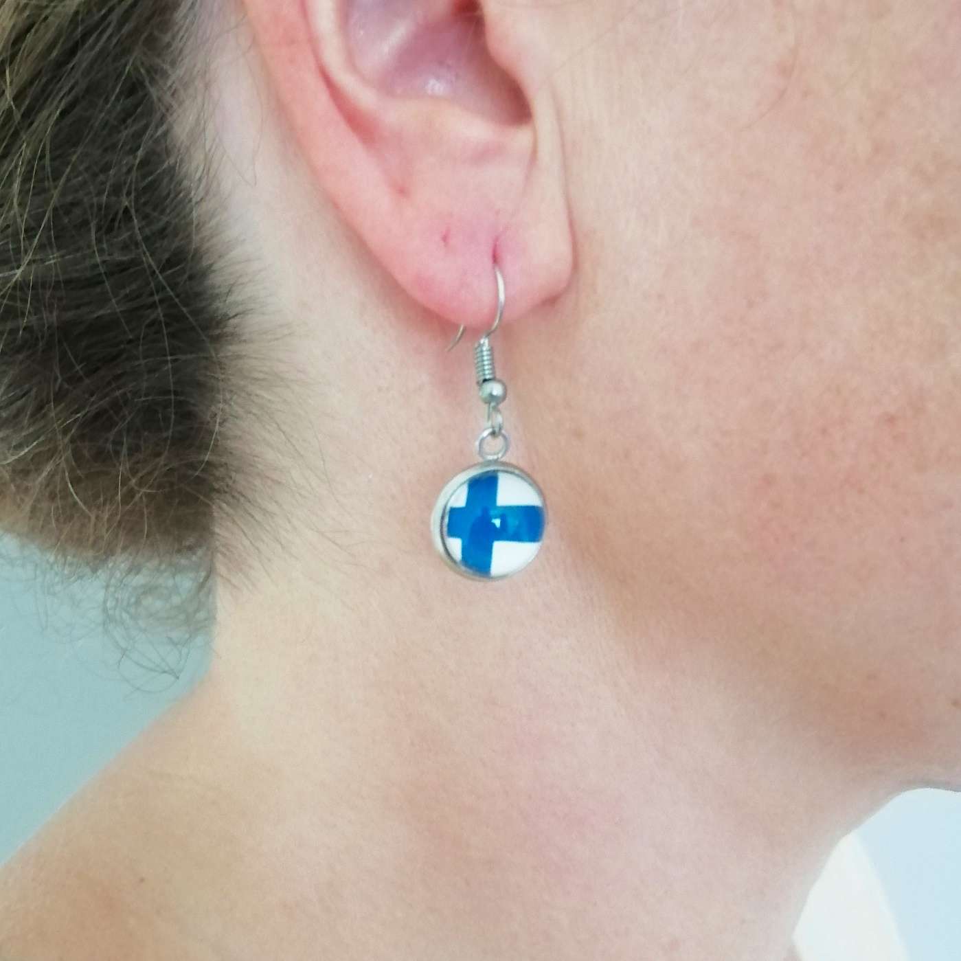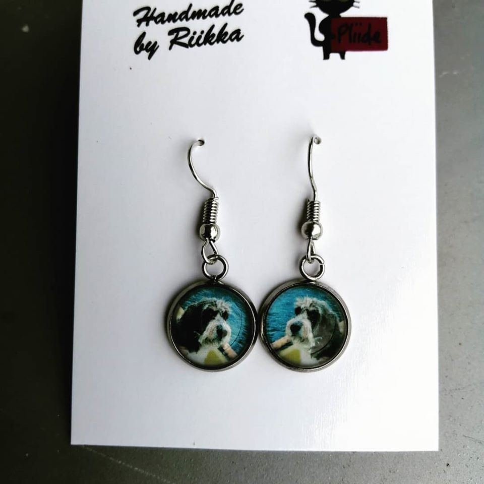 Korvikset on terästä, kuvan päällä lasi. Riipuksen koko 12 mm. Korvikset kestää vettä ja saunaa.