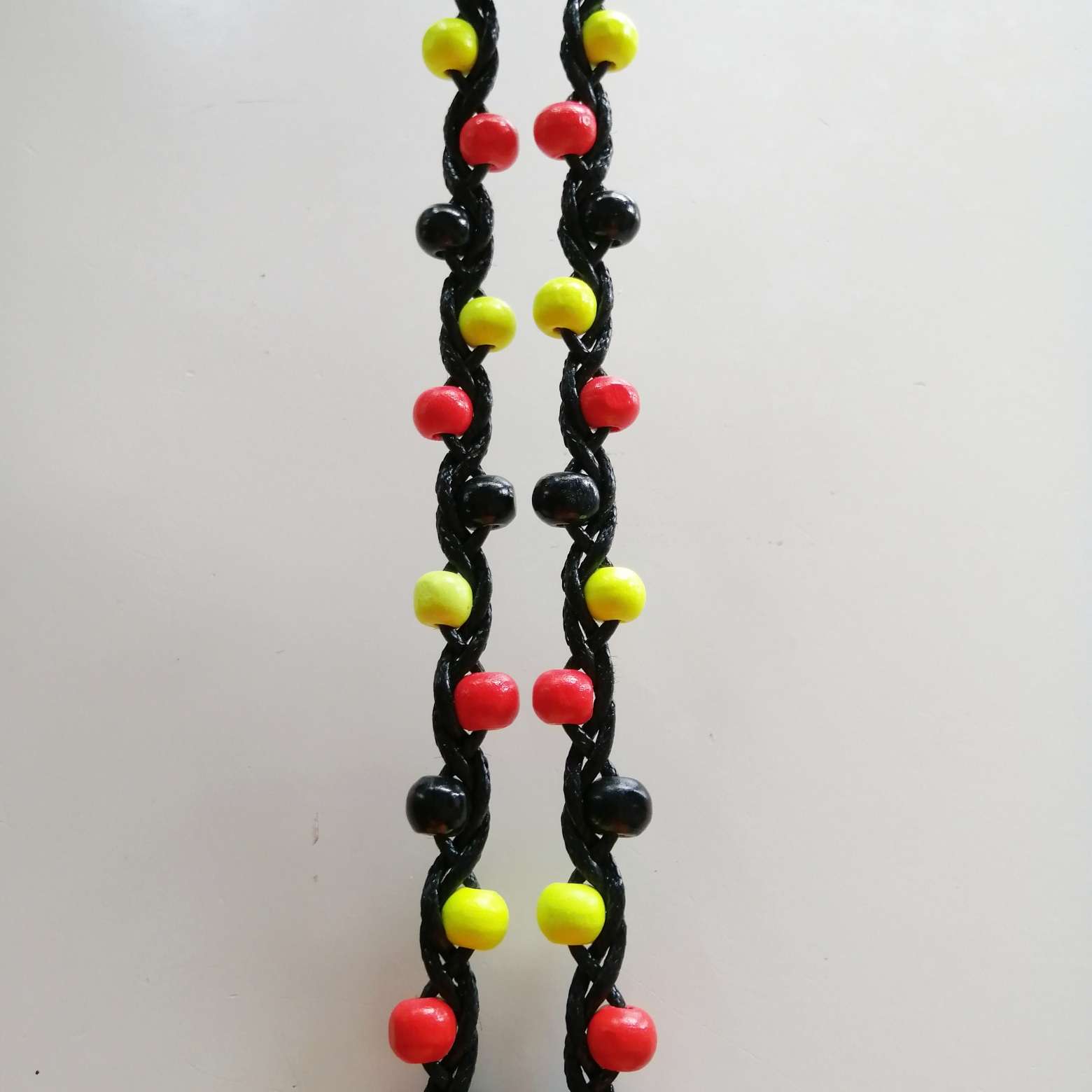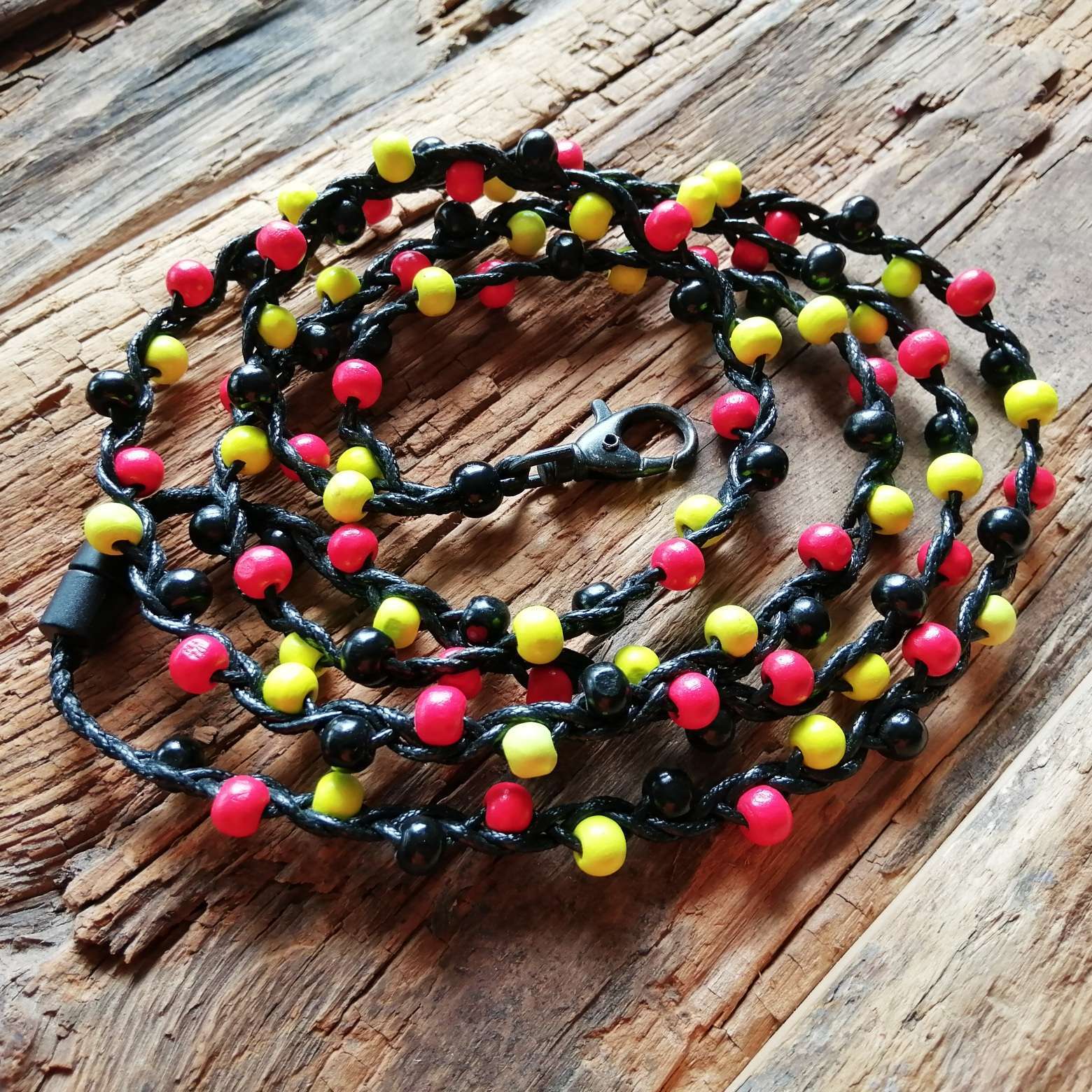 Olan yli avainnauha. Kokonaismitta n. 158 cm, josta rengas ja lukko n 5,5 cm. Vahattua puuvillanauhaa. Helmet puuta. Päässä turvalukko, joka aukeaa riuhtaisusta. Napsauttamalla saa takaisin kiinni.