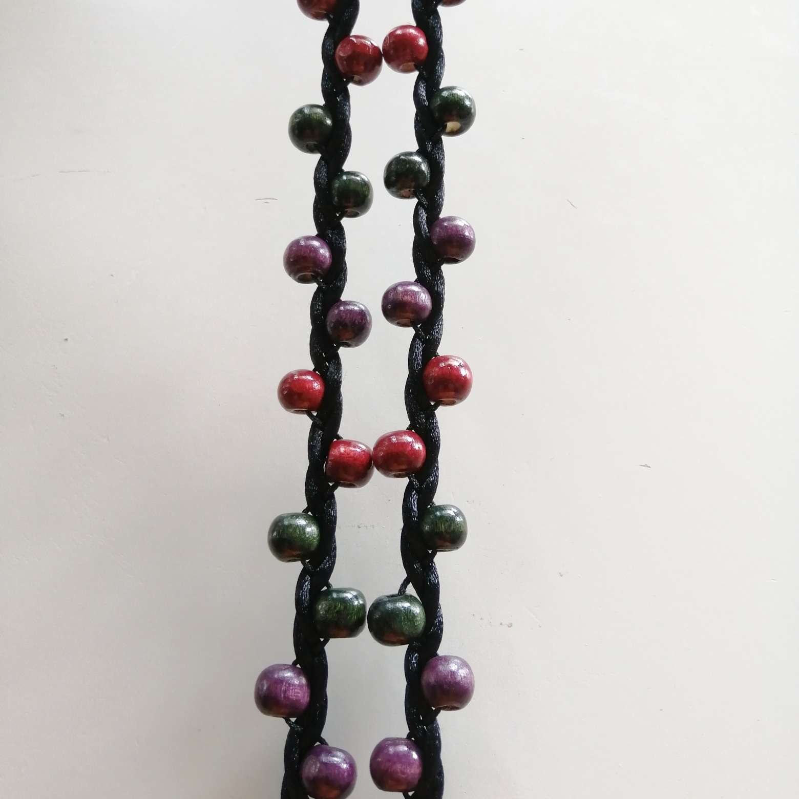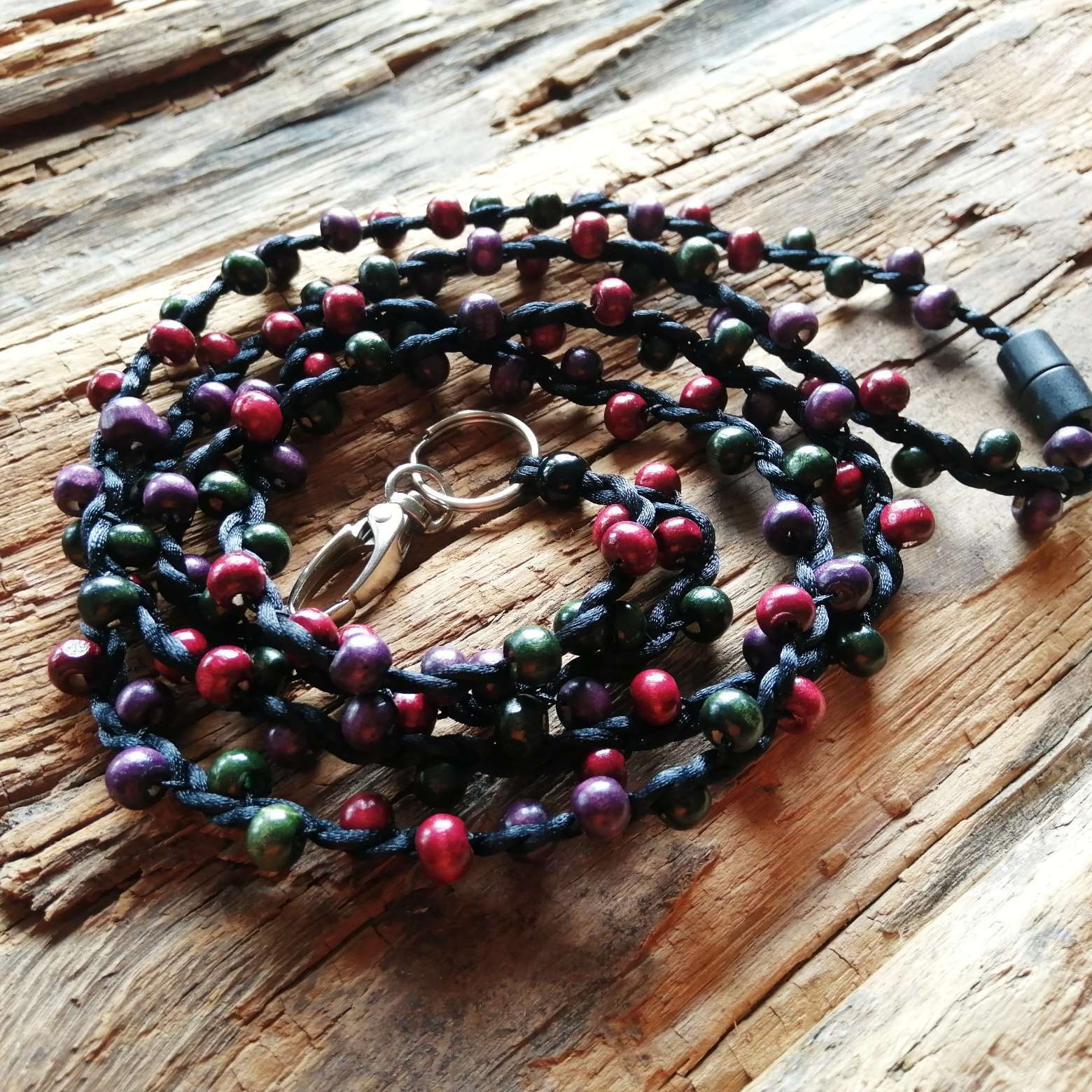 Olan yli avainnauha. Kokonaismitta n. 152 cm, josta rengas ja lukko n 5,5 cm. Kestävää satiini- ja nylonnauhaa. Helmet puuta. Päässä turvalukko, joka aukeaa riuhtaisusta. Napsauttamalla saa takaisin kiinni.